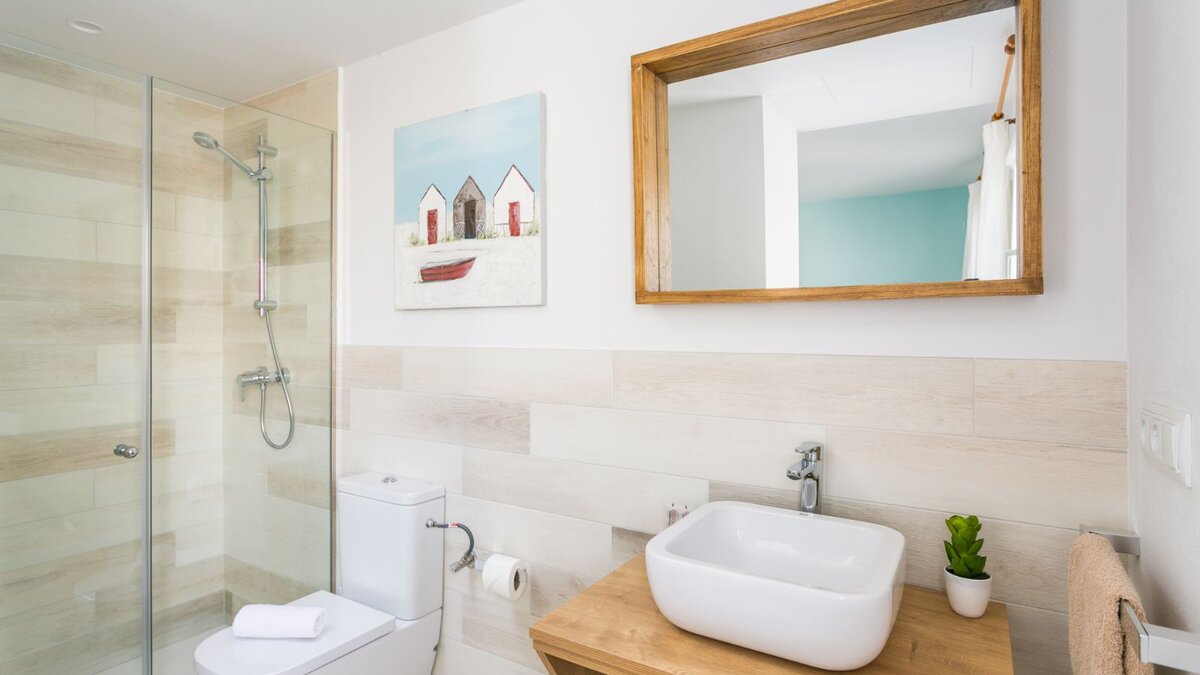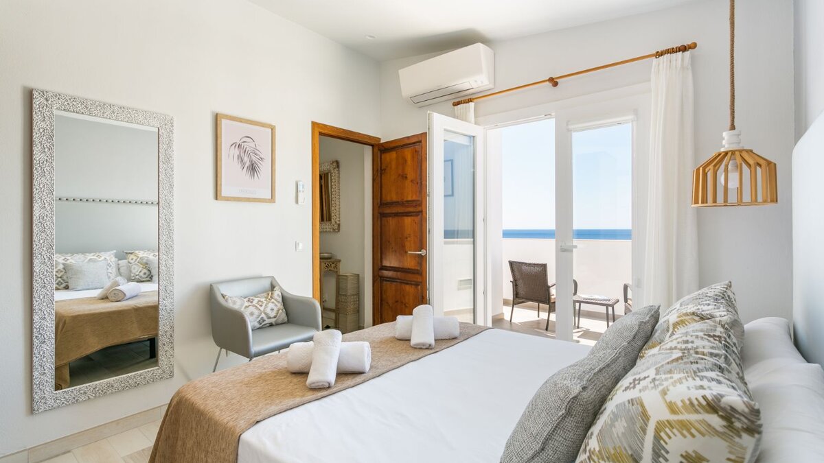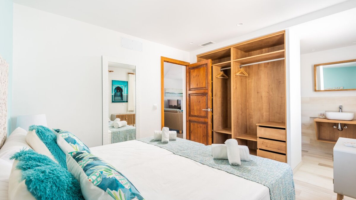 Auf der Eingangsebene befinden sich zwei ruhige Doppelschlafzimmer, jedes mit einem offenen Bad mit Dusche und großzügigem Stauraum im Kleiderschrank. Beiden Zimmer öffnen sich auf eine Gemeinschaftsterrasse mit atemberaubendem Meerblick – perfekt für ruhige Morgenstunden oder Momente bei Sonnenuntergang.