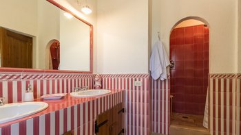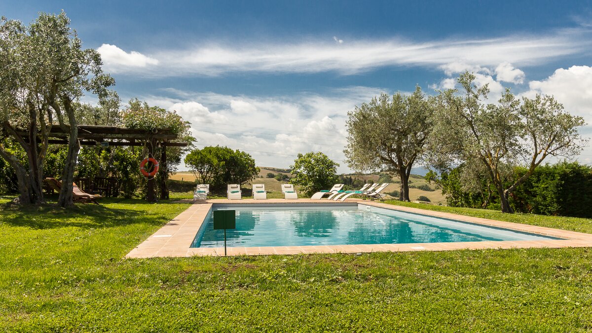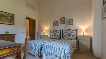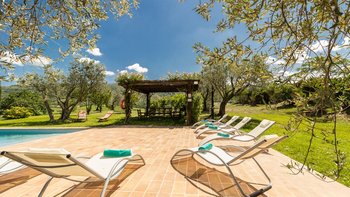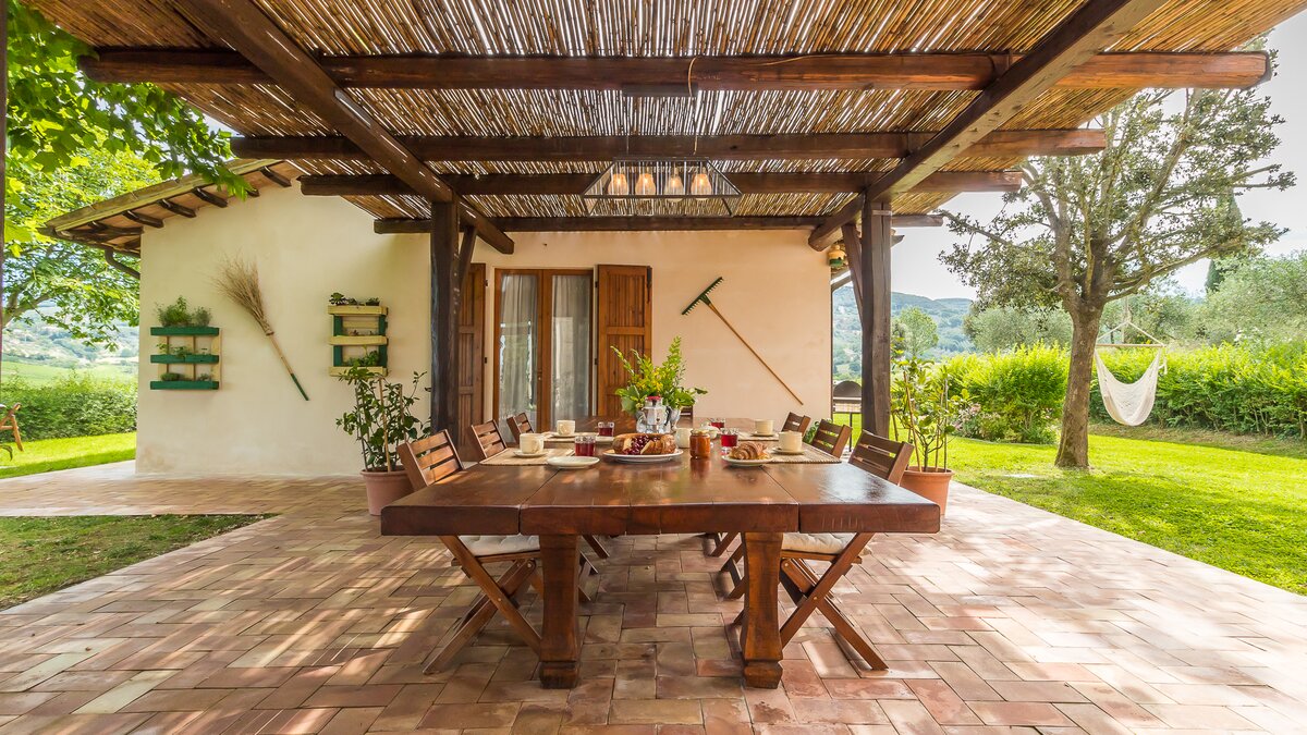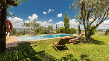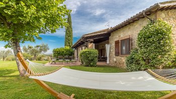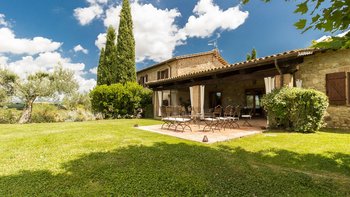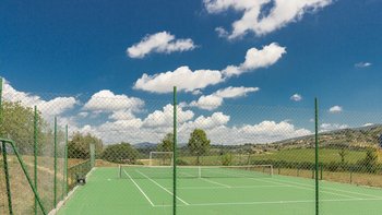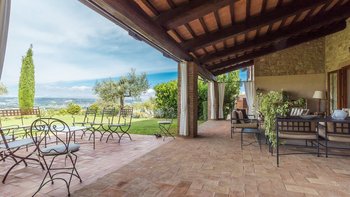 Der Gemeinschaftsraum erstreckt sich aus dem Haus zu einer schattigen Pergola und einem überdachten Wohnzimmer im Freien, das nach Westen ausgerichtet ist und durch einen offenen Innenhof mit Sundowner-Sitzplätzen verbunden ist. Dessen Grundstück mit altem Baumbestand und grasbewachsenen Terrassen umfasst einen 12-Meter-Pool und einen privaten Tennisplatz; und das Haus ist nur 5 km von den Geschäften und Restaurants in Montecchio und Guardea entfernt. Der mittelalterliche Todi ist 25 km entfernt.