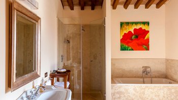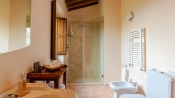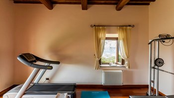 Das Gästehaus verfügt über vier Schlafzimmer, alle im ersten Stock; zwei Zweibettschlafzimmer, eines mit eigenem Bad und das andere mit Dusche en suite, und zwei Doppelschlafzimmer, eines mit eigenem Balkon und Bad en suite, und das andere mit eigenem Duschbad. Eine großartige Ergänzung des Gästehauses ist der gut ausgestattete Fitnessraum, die Sauna und das von außen zugängliche Apartment mit Doppelbettschlafzimmer, Wohnzimmer, Dusche und Küche. Deren Unterkunft ist daher ideal für drei Familien, die sich teilen. Villa Chianina ist 25 Minuten mit dem Auto von der historischen Stadt Orvieto und eine kurze Fahrt und von den Städten Fabro und Allerona entfernt.