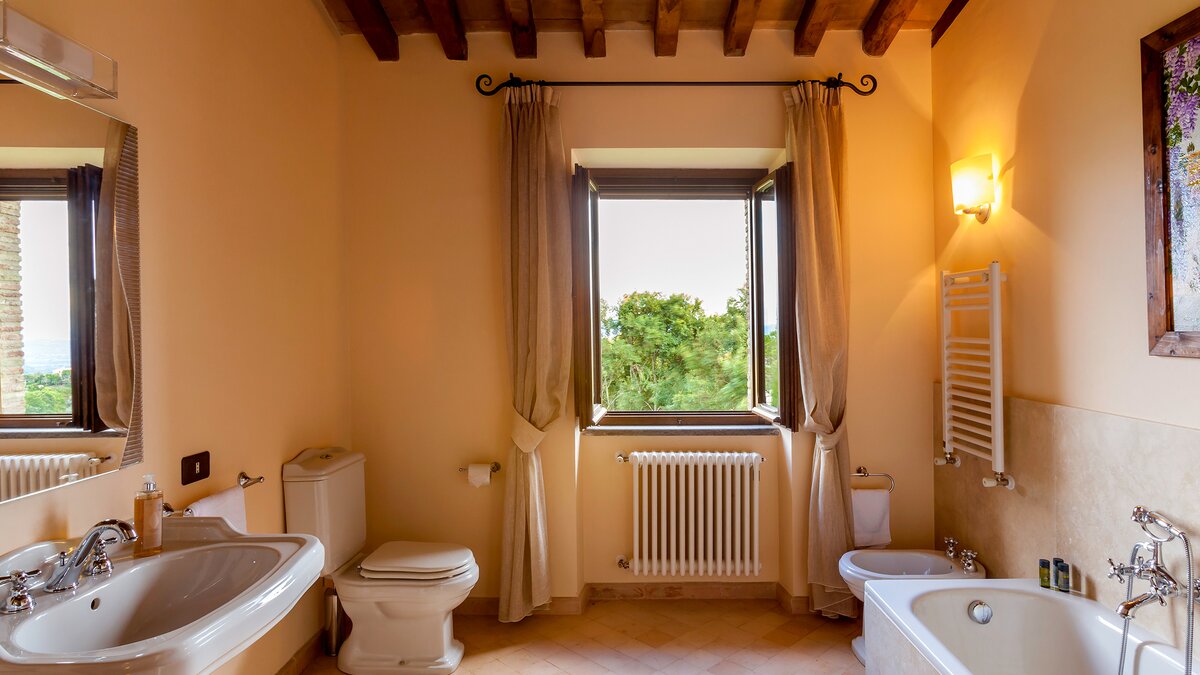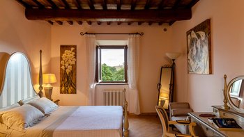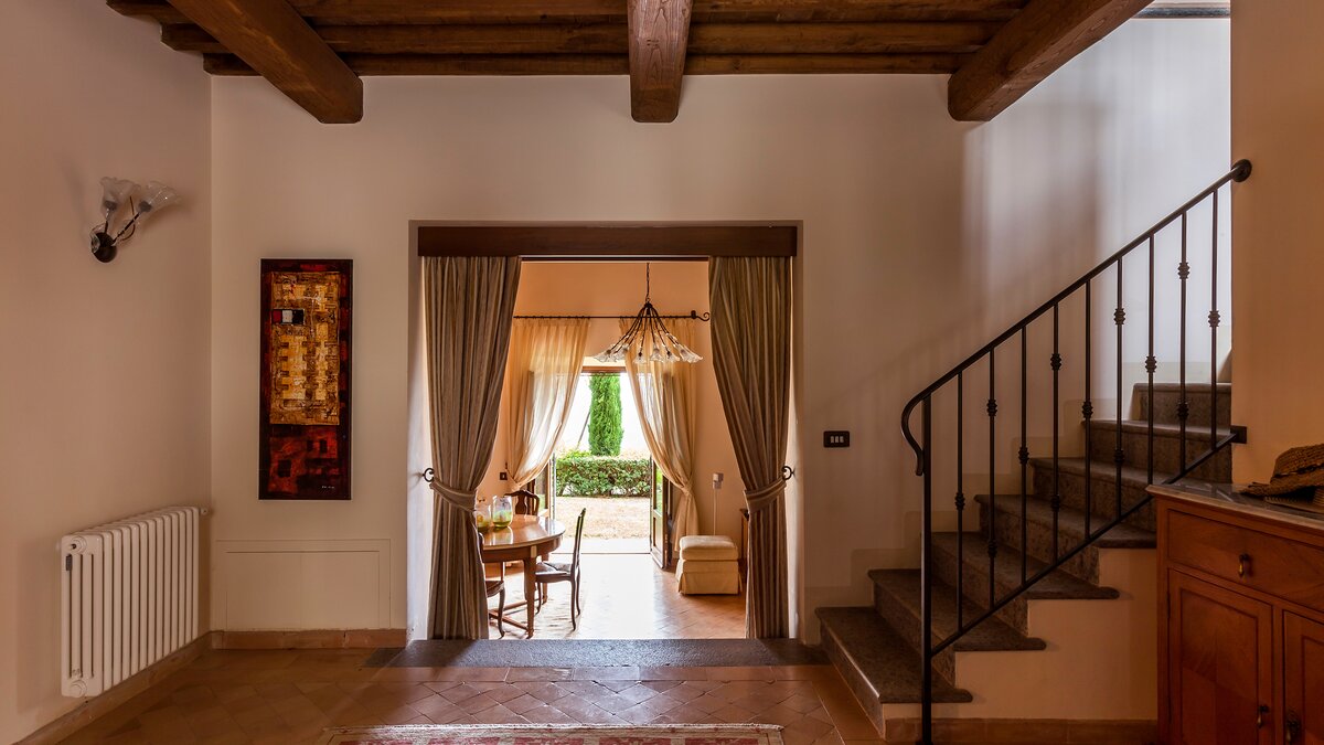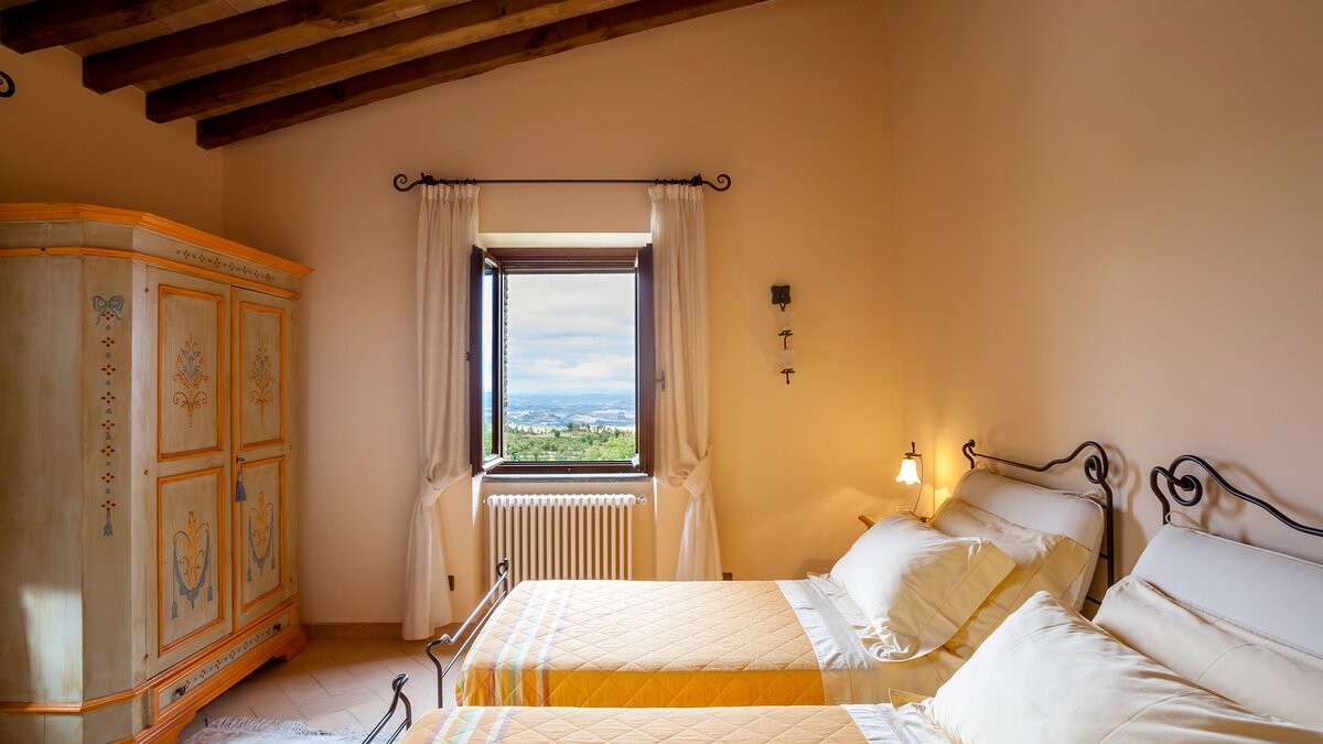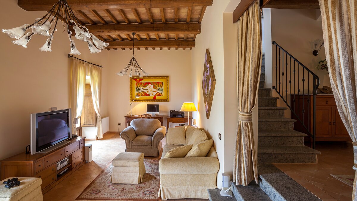 Die Villa Chianina befindet sich in Hanglage inmitten von Olivenbäumen und bietet einen unendlichen Blick auf die umbrische Landschaft und ist das ideale Urlaubsziel für große Familien oder Gruppen von Freunden, die einen erholsamen Rückzugsort in privater Umgebung suchen. Ein Innenhof, der die Hauptvilla und das Gästehaus verbindet, bietet einen Blick auf den privaten Infinity-Pool, mit vielen Liegestühlen zum Entspannen und dem Blick auf die Landschaft, die sich darunter erstreckt. Dessen Villa Chianina ist im typisch italienischen Stil eingerichtet und verfügt über moderne Einrichtungen für zusätzlichen Komfort. Mit Holzbalkendecken, Pastelltönen und modernen Möbeln ist die Villa Chianina eine elegante Mischung aus traditionellem und modernem Luxus. Die Hauptvilla verfügt über eine luxuriöse Eingangshalle, eine gut ausgestattete Küche, einen Frühstücksraum und ein Esszimmer im Erdgeschoss. Deren obere Ebene umfasst einen TV-Raum, eine exklusive Bar, einen Snooker-Raum und eine Lounge mit Zugang zum Balkon. Deren zweite Etage besteht aus einem Hauptschlafzimmer mit eigenem Bad und einem Doppelschlafzimmer mit Dusche en suite; das verbleibende Doppelschlafzimmer mit Dusche en suite befindet sich im dritten Stock.