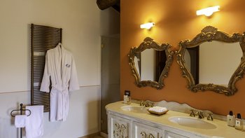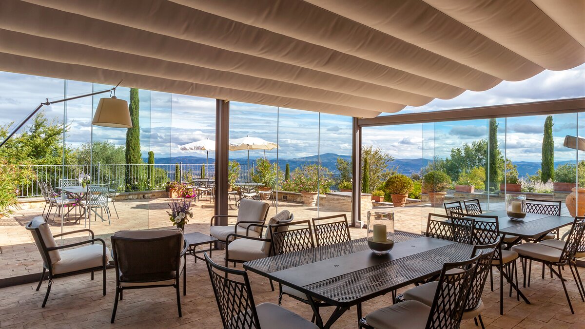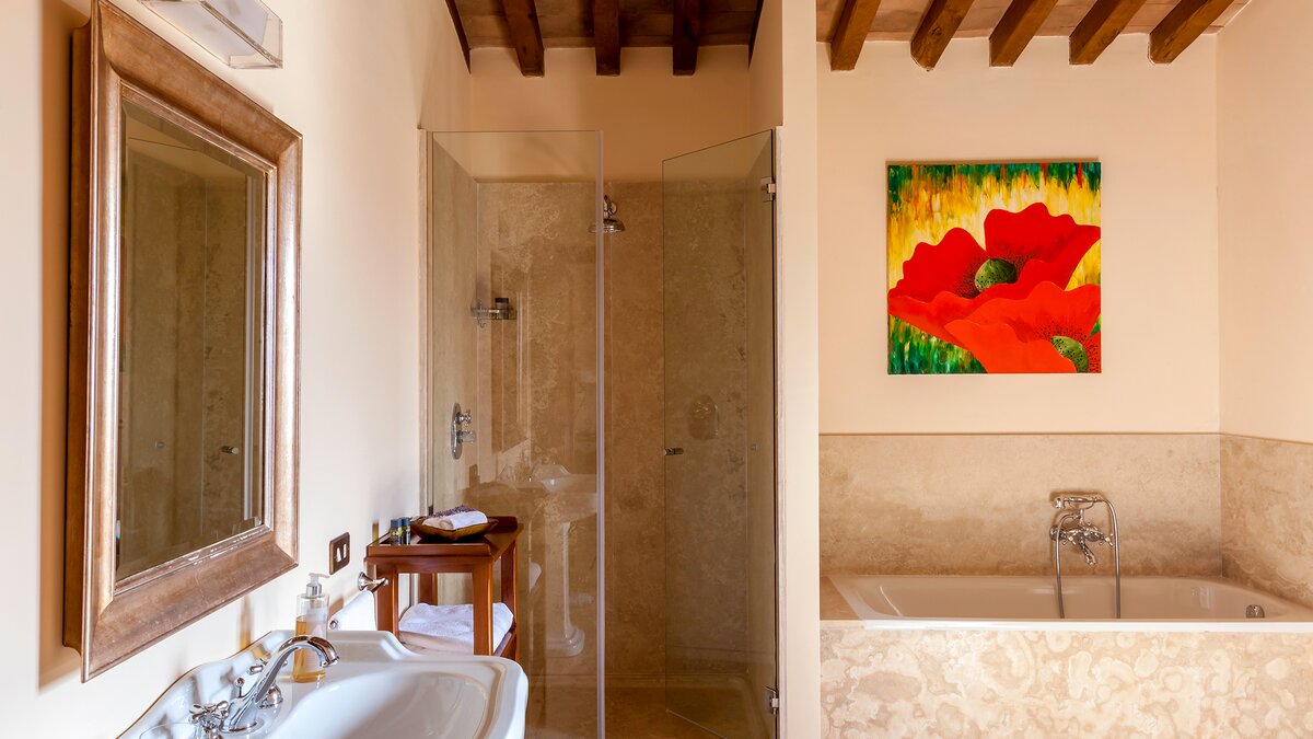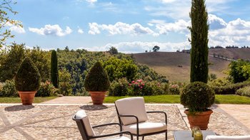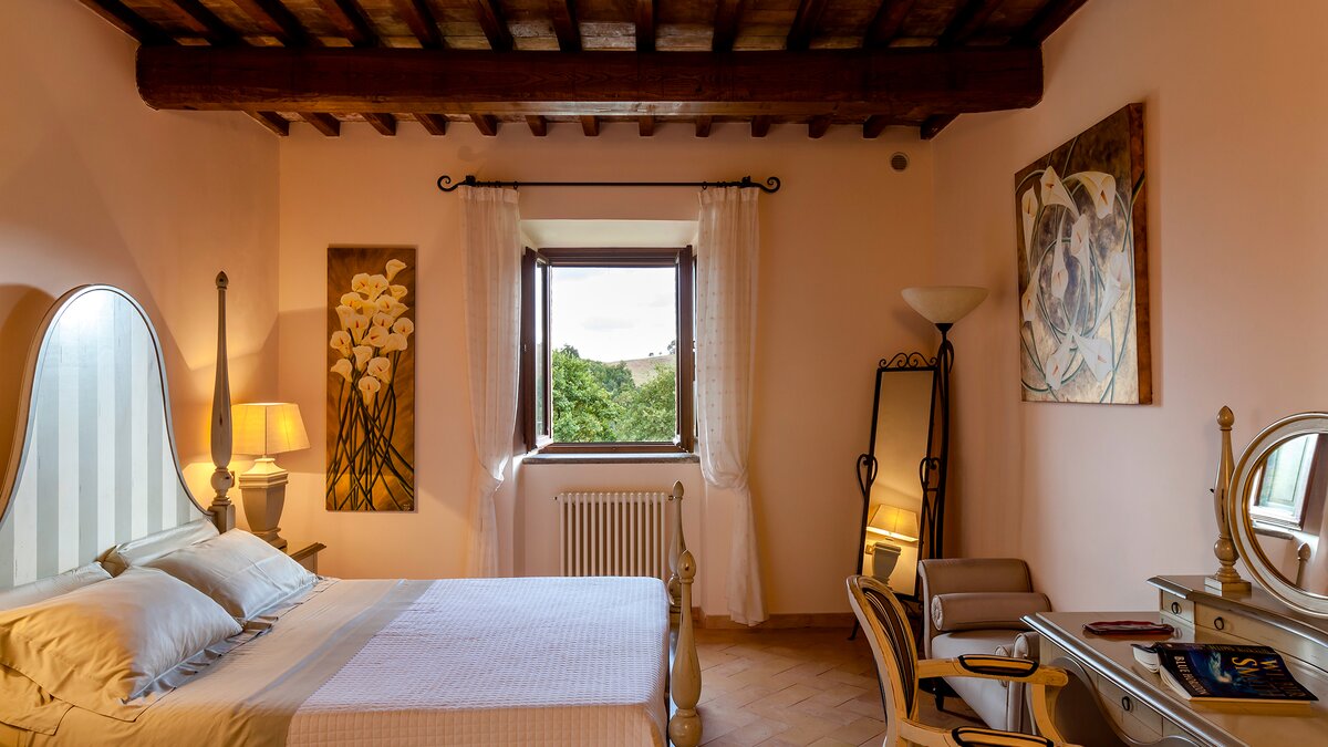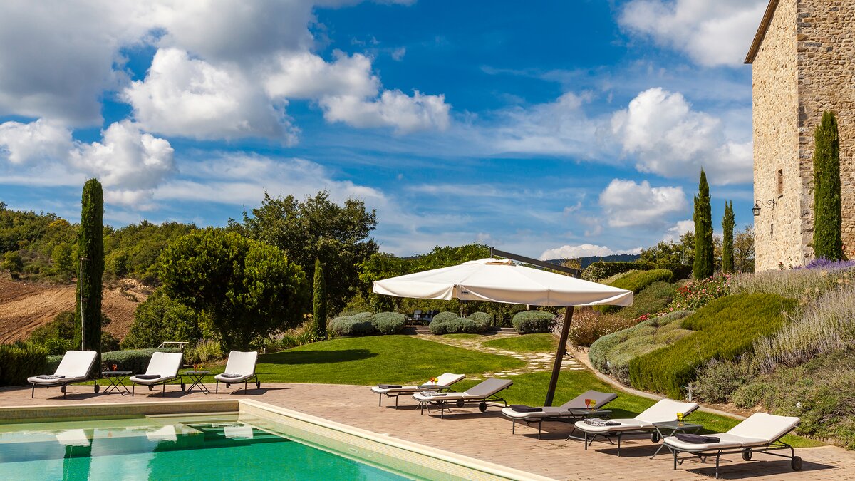 Die Villa Chianina befindet sich in Hanglage inmitten von Olivenbäumen und bietet einen unendlichen Blick auf die umbrische Landschaft und ist das ideale Urlaubsziel für große Familien oder Gruppen von Freunden, die einen erholsamen Rückzugsort in privater Umgebung suchen. Ein Innenhof, der die Hauptvilla und das Gästehaus verbindet, bietet einen Blick auf den privaten Infinity-Pool, mit vielen Liegestühlen zum Entspannen und dem Blick auf die Landschaft, die sich darunter erstreckt. Dessen Villa Chianina ist im typisch italienischen Stil eingerichtet und verfügt über moderne Einrichtungen für zusätzlichen Komfort. Mit Holzbalkendecken, Pastelltönen und modernen Möbeln ist die Villa Chianina eine elegante Mischung aus traditionellem und modernem Luxus. Die Hauptvilla verfügt über eine luxuriöse Eingangshalle, eine gut ausgestattete Küche, einen Frühstücksraum und ein Esszimmer im Erdgeschoss. Deren obere Ebene umfasst einen TV-Raum, eine exklusive Bar, einen Snooker-Raum und eine Lounge mit Zugang zum Balkon. Deren zweite Etage besteht aus einem Hauptschlafzimmer mit eigenem Bad und einem Doppelschlafzimmer mit Dusche en suite; das verbleibende Doppelschlafzimmer mit Dusche en suite befindet sich im dritten Stock.