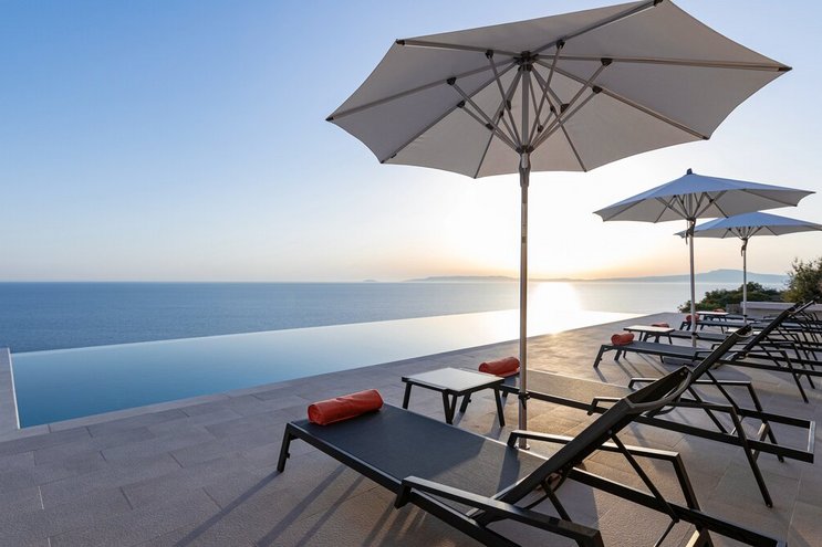 Die moderne und geräumige Unterkunft Villa Nupadi auf dem Peloponnes bietet einen unglaublichen Blick auf den Sonnenuntergang von ihrem eigenen Infinity-Pool.