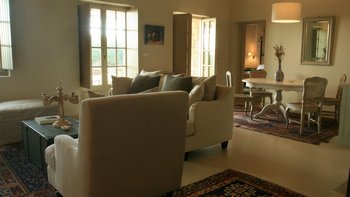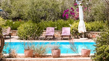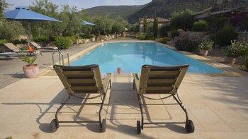 Jedes verfügt über eine Küche, ein Wohnzimmer und ein Schlafzimmer mit Doppelbett im Erdgeschoss, darüber eine Sitzecke und ein Zweibett-Schlafzimmer und eine holzverdeckte Terrasse im Freien mit Blick auf den 12-Meter-Pool. Dessen angrenzende Nebengebäude bietet Privatsphäre für das fünfte Schlafzimmer mit Bad, und alle sind klimatisiert. Perfekt für zwei Familien oder eine Gruppe von Freunden, ist der exzellente Service hier ein Markenzeichen.