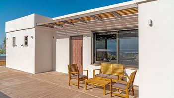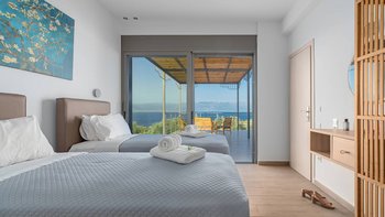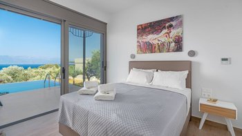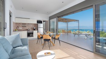 Diese helle und luftige Unterkunft mit unglaublichem Meerblick verkörpert Minimalismus und Modernität für einen luxuriösen Aufenthalt mit Blick auf die steilen Hügel des Peloponnes und das himmlische blaue Meer.