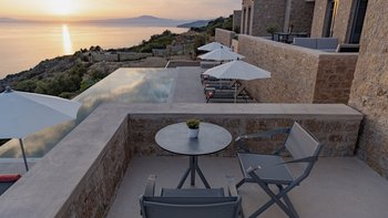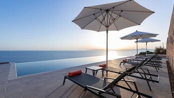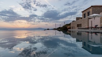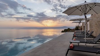 Die moderne und geräumige Unterkunft Villa Nupadi auf dem Peloponnes bietet einen unglaublichen Blick auf den Sonnenuntergang von ihrem eigenen Infinity-Pool.