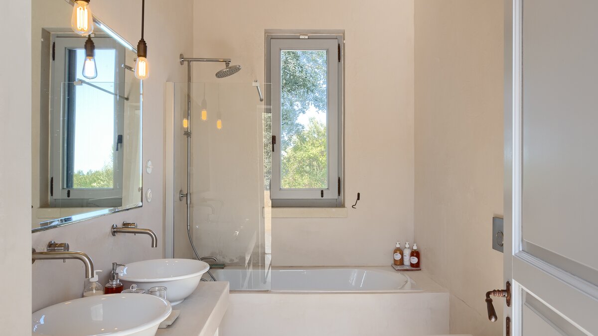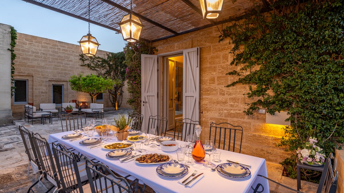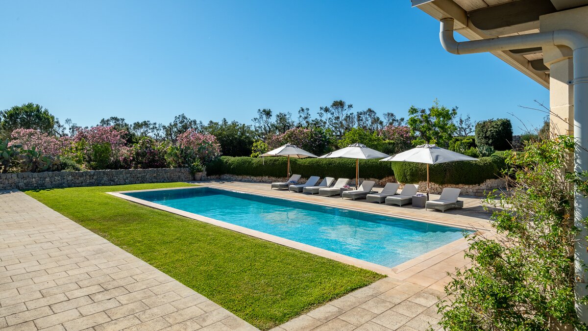 Die Masseria Pino Marittimo mit ihren Gewölbedecken, exquisiten Bögen und freiliegenden Steinmauern deutet auf den ersten Blick darauf hin, dass es sich um ein makellos restauriertes Bauernhaus handelt. Deren Masseria Pino Marittimo wurde 2014 erbaut, um die Schönheit Apuliens architektonischer Traditionen zur Schau zu stellen. Deren Eigentümer beauftragten OKA mit der Inneneinrichtung und der Villa und verfügen über maßgeschneiderte Handwerkskunst, die durch moderne Annehmlichkeiten wie ein Kühlsystem in jedem Zimmer und eine voll und ganz ausgestattete, moderne Küche ergänzt wird. Deren Villa mit Blick auf kilometerlange offene Landschaften liegt in einem gepflegten Garten mit Rasenflächen mit Zitronen- und Orangenbäumen, in einem ruhigen Olivenhain, etwas außerhalb des Dorfes Serrano. Im Haupthaus gibt es drei Schlafzimmer, ein luftiges Esszimmer mit kunstvollem Kronleuchter und langem Refektoriumstisch und ein kühles Wohnzimmer, dessen schlichter Stil perfekt für den aufwendig gefliesten Boden ist. Drei weitere Zimmer im Nebengebäude verfügen über ein Stockbettzimmer, ideal für Kinder. Und der Poolbereich mit Gartenrasen ist der Mittelpunkt für das Leben im Freien, komplett mit Esspavillon mit angrenzendem Sitzbereich, Sommerküche und Kinderspielzeug.