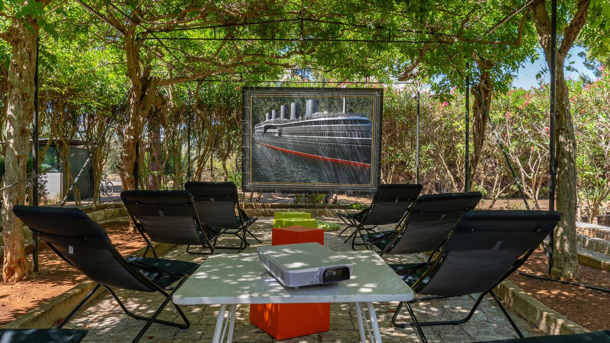 Das Open-Air-Kino kann auf Wunsch unter einer Pergola im Freien aufgestellt werden – einem Projektor und einer Leinwand und 12 Liegestühlen mit Fußstütze und Sitzsäcken.