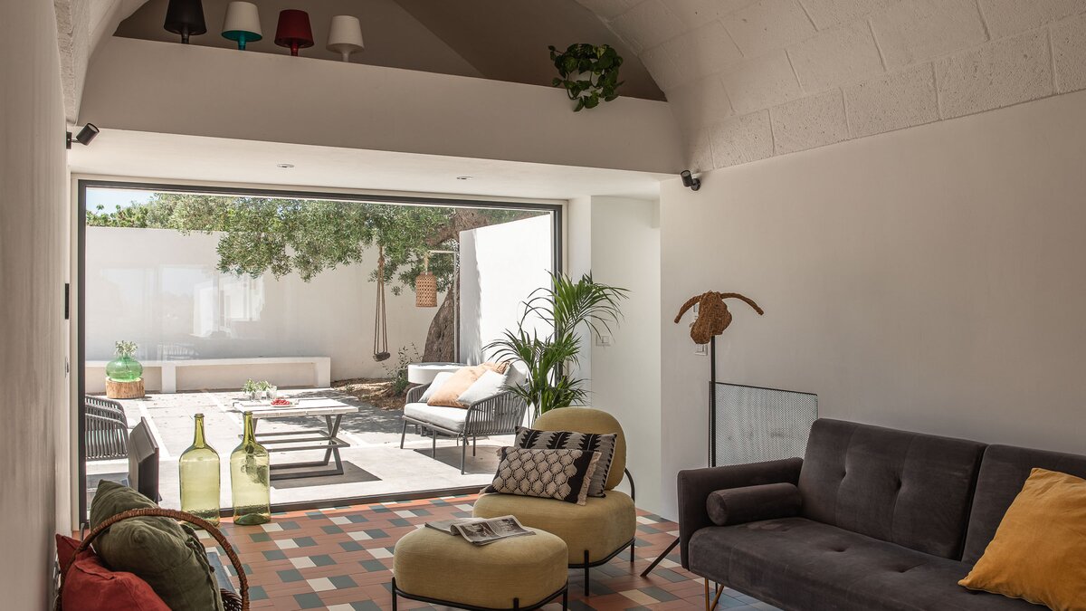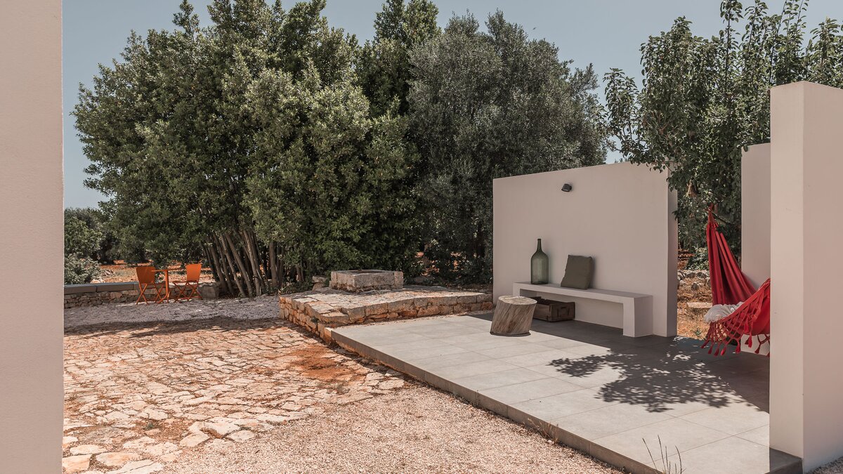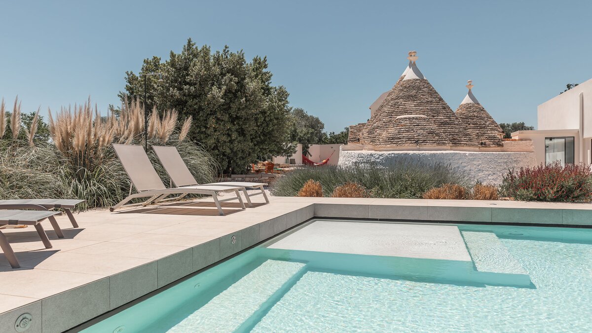 Draußen ist die Villa eine Oase für sonnenverwöhnte Entspannung. Entspannen Sie am Pool, entspannen Sie sich im Infinity-Pool mit Hydromassagebereich oder genießen Sie Mahlzeiten im Freien auf der Veranda mit eingebautem Grill und Zubereitungbereich. Weitere Außenecken laden zum sanften Schwingen in einer Hängematte unter Lorbeer und Olivenbäumen ein, umgeben vom sanften goldenen Licht Apuliens.