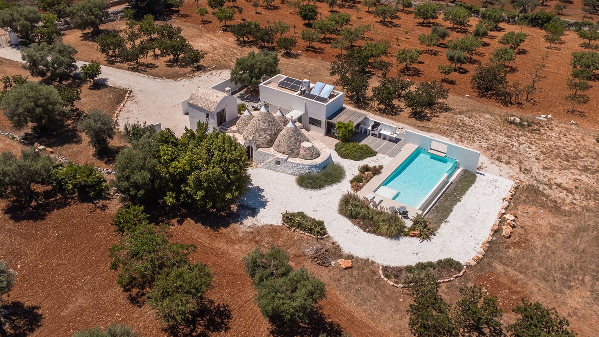 Die Wohnräume der Villa sind durchdacht über die wichtigsten Trulli, einen kleinen Steinturm und die moderne Erweiterung angeordnet. Denen vier Trulli-Kegel verfügen über einen einladenden Eingang, ein Schlafzimmer mit Doppelbett und eigenem Duschbad, eine Nische mit zwei Einzelbetten, ideal für Kinder, und ein geräumiges Duschbad. Ein verglaster Korridor verbindet die Trulli mit der modernen Erweiterung, die einen hellen, luftigen Wohnbereich, eine voll ausgestattete Küche und einen AnkleideraumundHauswirtschaftsraum beherbergt. Der von einem Oliven- und Granatapfelbaum geschmückte Innenhof bringt einen Hauch natürlicher Eleganz, während der vollständig in sich geschlossene Turm sich über zwei Ebenen erstreckt und ein Doppelbett und auf einer Mezzaninebene bietet, die sich zu einem Flachdachbereich und einem Duschbad und auf der unteren Eingangsebene öffnet.