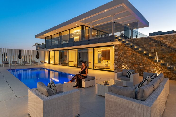 Das Ovio ist eine geräumige und supermoderne Villa mit einem Privater Pool und einem beheizten Whirlpool und bietet Ihnen von jedem der stilvollen Zimmer Panoramablick auf das Meer.