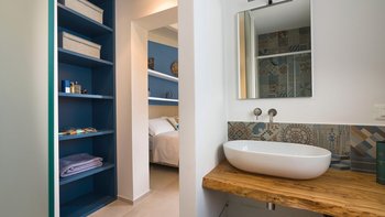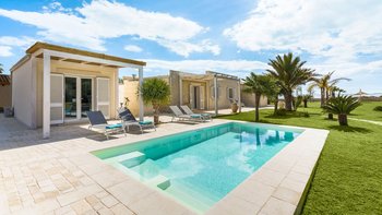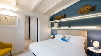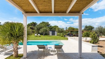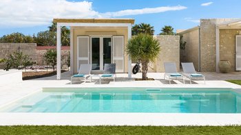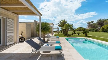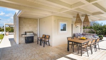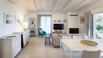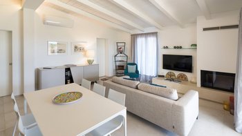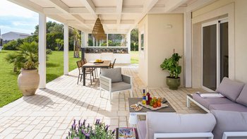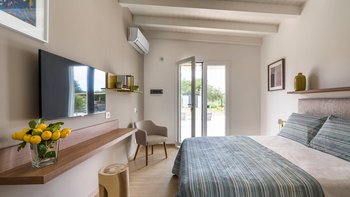 Im Inneren werden die Gäste von einem offenen Grundriss Wohn-, Ess- und Küchenbereich begrüßt. Dieser Raum ist mit hochwertigen Innenräumen ausgestattet, mit modernen Geräten ausgestattet und ist ein ruhiger Bereich, in dem sich die Gäste entspannen können, während sie hochwertige Zeit miteinander verbringen. Weiters in der Villa gibt es drei Doppelschlafzimmer; alle mit Dusche en suite und ein zusätzliches Schlafzimmer im Gartenanbau, mit eigenem Zugang zum Außenbereich. Aller dieser Zimmer sind sauber und frisch und auf höchstem Niveau eingerichtet.