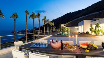 Ideal gelegen, nur 2 km von der Küste entfernt und mit unglaublichem Meerblick, ist Bellamare ein atemberaubendes modernes Haus im Osten Siziliens. Dessen Villa selbst bietet Platz für bis zu 14 Personen und ist geräumig und modern mit hellen weißen Wänden und kühlen Fliesenböden im gesamten Gebäude. Der Wohnbereich ist bemerkenswert und komplett offen gestaltet, so dass sich große Gruppen im Urlaub unterhalten können. Es gibt eine weiße Marmorküche mit einer riesigen Insel, die als Frühstücksbar dient, und einen separaten Essbereich mit einem großen quadratischen Tisch und Platz für alle Gäste, um gemeinsam zu speisen; das gegenüberliegende Ende dieses Bereichs ist mit bequemen Sitzgelegenheiten ausgestattet, um drinnen zu entspannen. Bodenhohe Glastüren führen auf die Terrasse, die sich über die gesamte Länge des Hauses erstreckt. Es gibt einen großen Esstisch im Freien, der perfekt positioniert ist, um den Blick auf das Meer zu genießen, neben einem beeindruckenden 18 m langen privaten Pool mit bequemen Liegen und Sonnenschirmen.