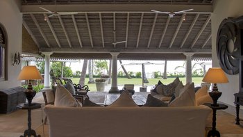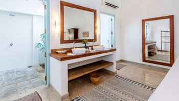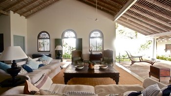 Die Villa selbst wurde wunderschön gestaltet und verfügt über einen großen offenen Wohnbereich mit bequemen Sitzgelegenheiten und hohen Holzbalkendecken. Dieser öffnet sich auf die Terrasse mit einem Tisch für Mahlzeiten im Freien und weitere Sitzgelegenheiten zum Entspannen. Der PRIVATER POOL ist ziemlich spektakulär, begleitet von Sonnenschirmen und Holzliegen mit Blick auf den Garten mit Rasen und auf das Meer. Dessen Erdgeschoss verfügt über zwei Schlafzimmer, die beide en suite mit Super-Kingsize-Himmelbetten sind. Auf der ersten Etage befindet sich ein weiteres Schlafzimmer mit Doppelbett mit Dusche, das über eine Außentreppe erreichbar ist.