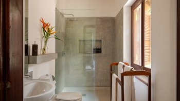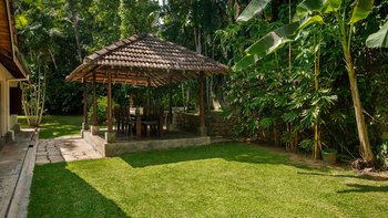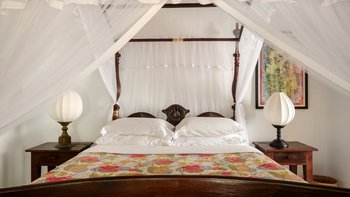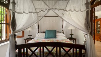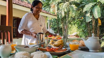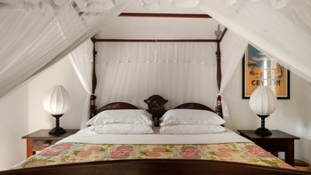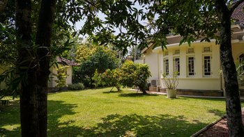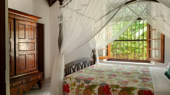 Dieser magische Bungalow im Kolonialstil verfügt über weite und hohe Räume im Freien mit ruhigem Blick auf den Garten, so dass Sie die exotische Landschaft Sri Lankas vom Komfort Ihres eigenen Wohnraums aus vollständig umarmen können. Direkt in der Mitte des Anwesens steht ein kleiner Außenbrunnen, der mit jungen, blühenden Seerosenblättern bedeckt ist. Es gibt vier Schlafzimmer mit eigenem Bad, jedes mit großen und luftigen Fenstern, Deckenventilatoren und Zugang zur Klimaanlage. Zwei verfügen über Kingsize-Betten und die anderen zwei sind Queensize-Betten, wobei drei der vier Badezimmer als Mischung aus Innen- und Außenbereich gestaltet sind. Die Villa ist mit einem eigenen Koch und Haushälterin ausgestattet, so dass Sie sich entspannen können, da sie auf alle Ihren Bedürfnisse eingehen und es Ihnen ermöglichen, die köstliche lokale sri-lankische Küche zu probieren.