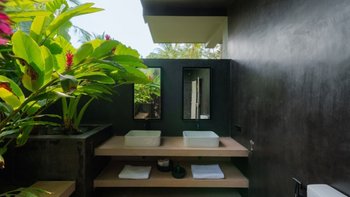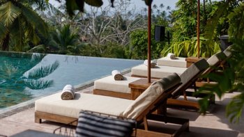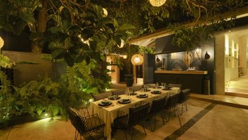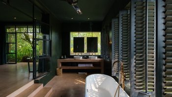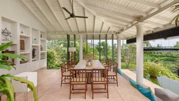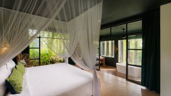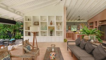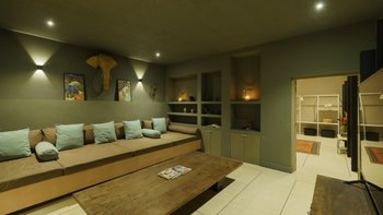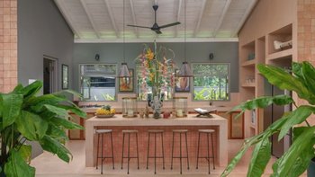 Im Inneren sind die Wohnbereiche so gestaltet, dass sie Menschen zusammenbringen und gleichzeitig viel Platz zum Entspannen bieten. Der Ess-/Sitzpavillon verfügt über eine offene Küche mit Blick auf den Garten und den See. Bequeme Sitzbereiche sind ideal, um der Hitze zu entfliehen, während ein spezieller Fernsehraum für Unterhaltung sorgt. Für diejenigen, die es aktiver mögen, sorgt ein Billardtisch im offenen Spielepavillon für die Verspieltheit der Villa.