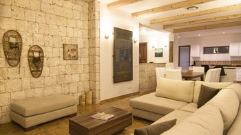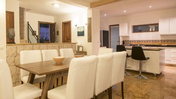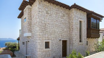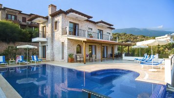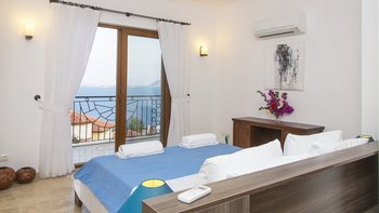 Ein modernes Haus, aber nicht ohne Charakter, diese Familienvilla liegt direkt am Meer in der Nähe der schönen, entspannten Stadt Kas. Im Erdgeschoss befindet sich ein offen geschnittenes Zimmer, das stilvoll in sanften Erdtönen eingerichtet ist, mit einer Holzbalkendecke und freiliegender Steinmauer, die die Küche, den Wohn- und Essbereich umrahmen, mit Türen zu einer überdachten Veranda, auf der Sie im Freien grillen können. Ein Schlafzimmer mit Bad teilt sich diese Etage und öffnet sich zu einer Rasenfläche am Pool; und es gibt drei Schlafzimmer auf der oberen Ebene, eines mit einem romantischen (geschlossenen) osmanischen Balkon, die Master-Suite mit eigenem Nassraum und Bad, und alle mit Klimaanlage und Zugang zu einem offenen Balkon mit Meer- oder Gartenblick.