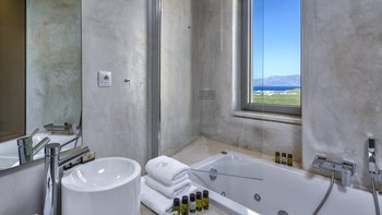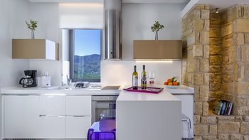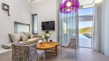 Der moderne Wohnbereich verfügt über Natursteinelemente und eine offene Küche mit hochwertigen Geräten. Deren Hauptschlafzimmer, das über eine geräumige Terrasse zugänglich ist, bietet ein eigenes Bad mit einer Badewanne und Meerblick. Ein kleines Schlafsofa im Wohnbereich bietet Platz für einen weiteren Gast oder ein Kind.