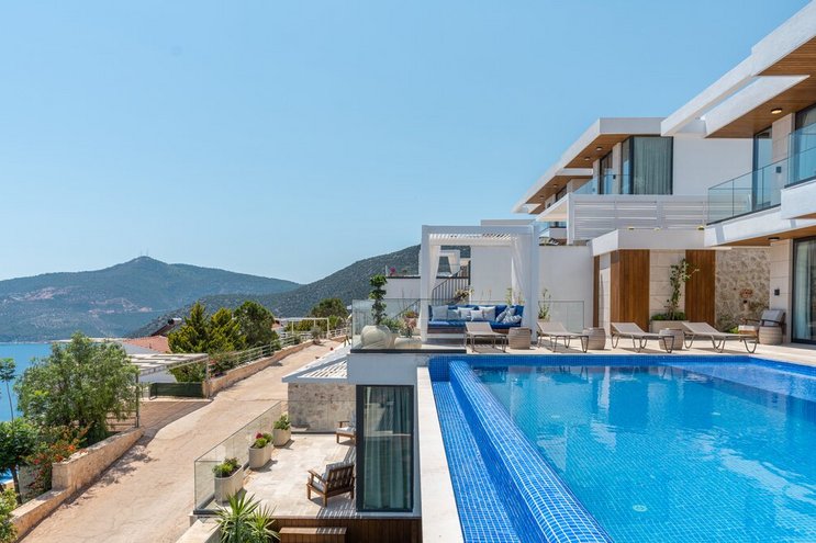Die einladende und moderne Villa Daglari ist ideal für einen Familien- oder Gruppenaufenthalt in der Nähe des Zentrums von Kalkan, mit herrlichem Meerblick und einem Infinity-Pool.