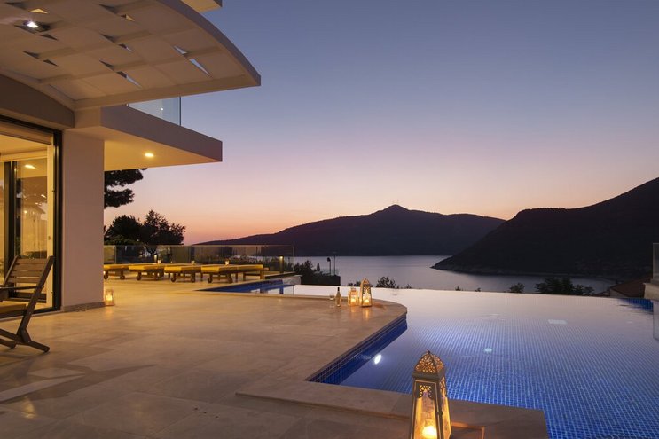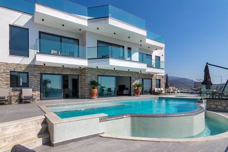 Mit herrlichem Blick von der schönen Poolterrasse über Kalkan und den nahe gelegenen Inseln, ist dies eine luxuriöse, moderne Villa, die Stil und Qualität ausstrahlt.