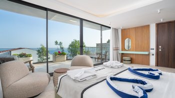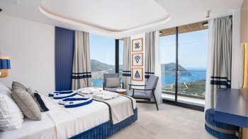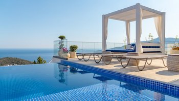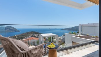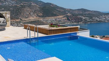 Im Außenbereich der Villa befindet sich eine weitläufige Poolterrasse mit übergroßen Liegen und gepolsterten Sitzbereichen, die den idealen Rahmen zum Faulenzen und Beisammensein bietet. Der 10-Meter-Infinity-Pool scheint mit dem Horizont zu verschmelzen und bietet eine erfrischende Pause von der türkischen Sonne. Ein einladender Grill- und Essbereich im Freien sorgt für unvergessliche Zusammenkünfte unter dem Sternenhimmel. Für diejenigen, die sich fit halten, erwartet Sie ein privates Fitnessstudio im unteren Stockwerk mit atemberaubendem Meerblick. Deren Villa befindet sich in der Kalamar-Bucht und bietet einfachen Zugang zum charmanten Stadtzentrum von Kalkan und den unberührten Stränden, so dass die Gäste das Gute der türkischen Riviera erkunden können.