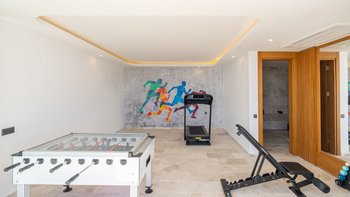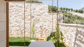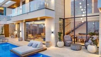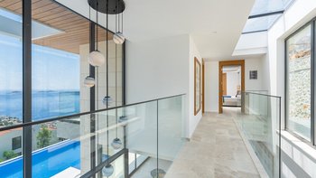 Das elegante Interieur der Villa umfasst einen offenen Wohnbereich im Erdgeschoss, der in natürliches Licht getaucht ist, mit Plüschmöbeln und einer Küche mit verschiedenen Holzelementen ausgestattet ist. Eine Galerie im Zwischengeschoss und eine große Glasverglasung verstärken die Wirkung des weitreichenden Blicks auf das Mittelmeer der Villa. Denen fünf Schlafzimmer mit eigenem Bad, die sich auf drei Etagen verteilen, bieten private Zufluchtsorte mit modernen Annehmlichkeiten. Deren Master-Suite im ersten Stock verfügt sogar über eine Indoor-Whirl-Badewanne, in der Sie sich nach einem Tag voller sonnenverwöhnter Abenteuer entspannen können.