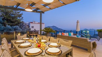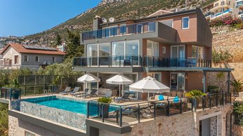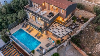 Die einladende und moderne Villa Daglari ist ideal für einen Familien- oder Gruppenaufenthalt in der Nähe des Zentrums von Kalkan, mit herrlichem Meerblick und einem Infinity-Pool.