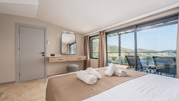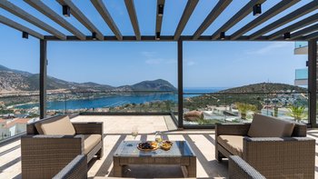 Die Villa Deniz liegt vor der Bergkulisse und bietet einen herrlichen Meerblick sowohl vom Infinity-Pool und auch von den geräumigen Terrassen auf jeder Etage.
