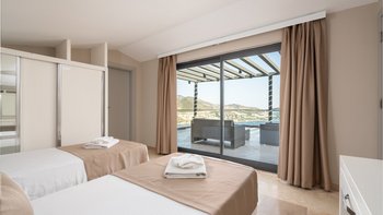 Die Innenräume haben eine moderne Atmosphäre mit viel Licht aufgrund der großen raumhohen Fenster in den Wohnbereichen und einigen Schlafzimmern. Deren Unterkunft erstreckt sich über drei Ebenen, mit einem modernen offenen OFFENER GRUNDRISS im Erdgeschoss und einem Schlafzimmer mit Doppelbett mit eigenem Bad und Balkon, einem Schlafzimmer mit Doppelbett und Bad und einem Jacuzzi-Bad und einem Doppelbett mit eigenem Bad im ersten Stock. Im zweiten Stock ein Doppel- und Zweibettzimmer, die sich einen großen Balkon teilen und beide mit eigenem Bad en suite