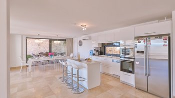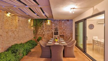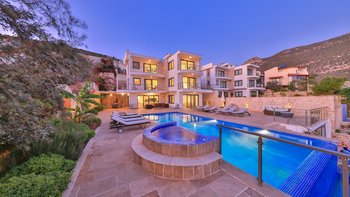 Im Haupthaus gibt es 4 Schlafzimmer mit eigenem Bad, die sich auf zwei Etagen split erstrecken und alle haben Zugang zum Balkon. Ein weiteres Schlafzimmer mit eigenem Bad befindet sich im Poolanbau, der über einen Wohnbereich und eine eigene Terrasse verfügt. Nahe gelegene Annehmlichkeiten sind in Kalkan leicht zu erreichen. Dessen Altstadt und der Hafen sind ca. 600 m entfernt.