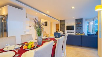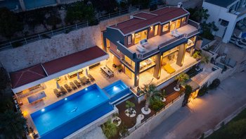 Hoch oben auf dem Hügel über Kalkan inmitten einer kleinen Gruppe ähnlicher Immobilien gelegen, ist diese fabelhafte Familienvilla geräumig, stilvoll und hervorragend gestaltet. Mit kompletter Klimaanlage, monochromem Dekor und kühlen Marmorböden ist das Erdgeschoss ein luftiger offener Raum, wo das große Wohnzimmer zur Ess- und Poolterrasse führt und die Küche mit modernen Geräten und Arbeitsflächen aus Granit ausgestattet ist. Denen sechs Schlafzimmer der Villa befinden sich in den beiden oberen Etagen, mit einer Mischung aus Doppel- und Zweibettzimmern für Familien oder Gruppen von Freunden und raumhohen Fenstern, um zu einer herrlichen Aussicht aufzuwachen.