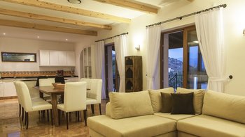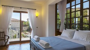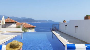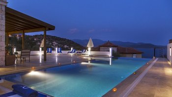Ein modernes Haus, aber nicht ohne Charakter, diese Familienvilla liegt direkt am Meer in der Nähe der schönen, entspannten Stadt Kas. Im Erdgeschoss befindet sich ein offen geschnittenes Zimmer, das stilvoll in sanften Erdtönen eingerichtet ist, mit einer Holzbalkendecke und freiliegender Steinmauer, die die Küche, den Wohn- und Essbereich umrahmen, mit Türen zu einer überdachten Veranda, auf der Sie im Freien grillen können. Ein Schlafzimmer mit Bad teilt sich diese Etage und öffnet sich zu einer Rasenfläche am Pool; und es gibt drei Schlafzimmer auf der oberen Ebene, eines mit einem romantischen (geschlossenen) osmanischen Balkon, die Master-Suite mit eigenem Nassraum und Bad, und alle mit Klimaanlage und Zugang zu einem offenen Balkon mit Meer- oder Gartenblick.