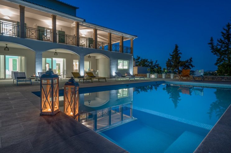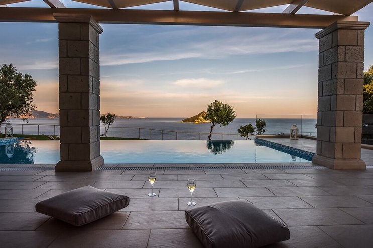 Diese moderne, neu erbaute Unterkunft in Zakynthos verfügt über wunderschön eingerichtete Innenräume und eine große Poolterrasse in einer atemberaubenden Lage.