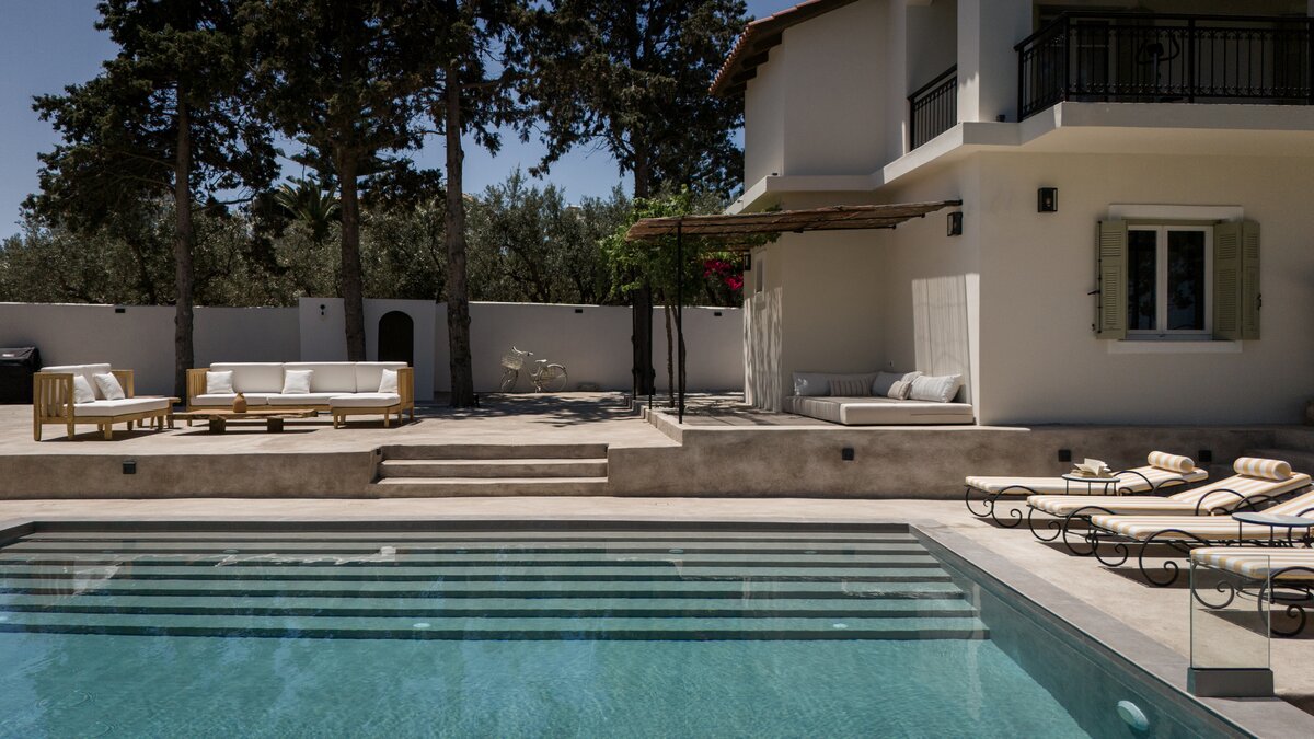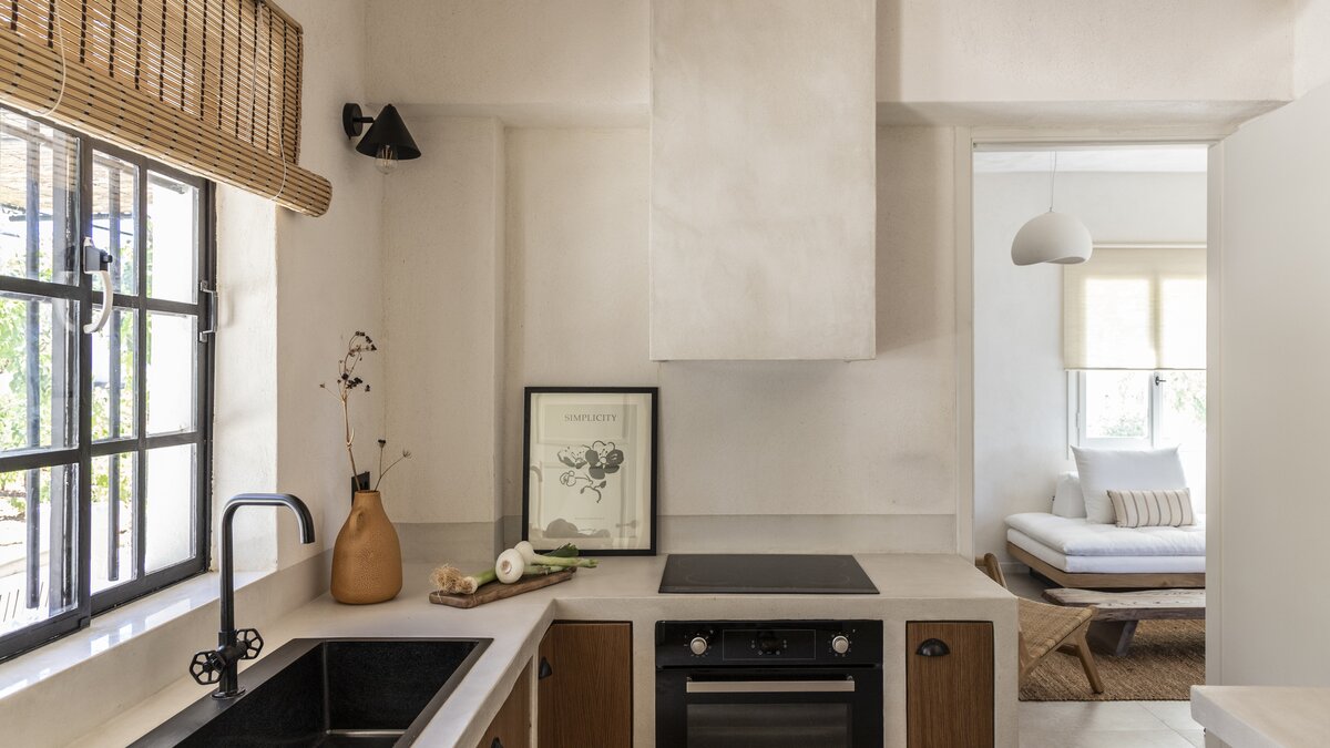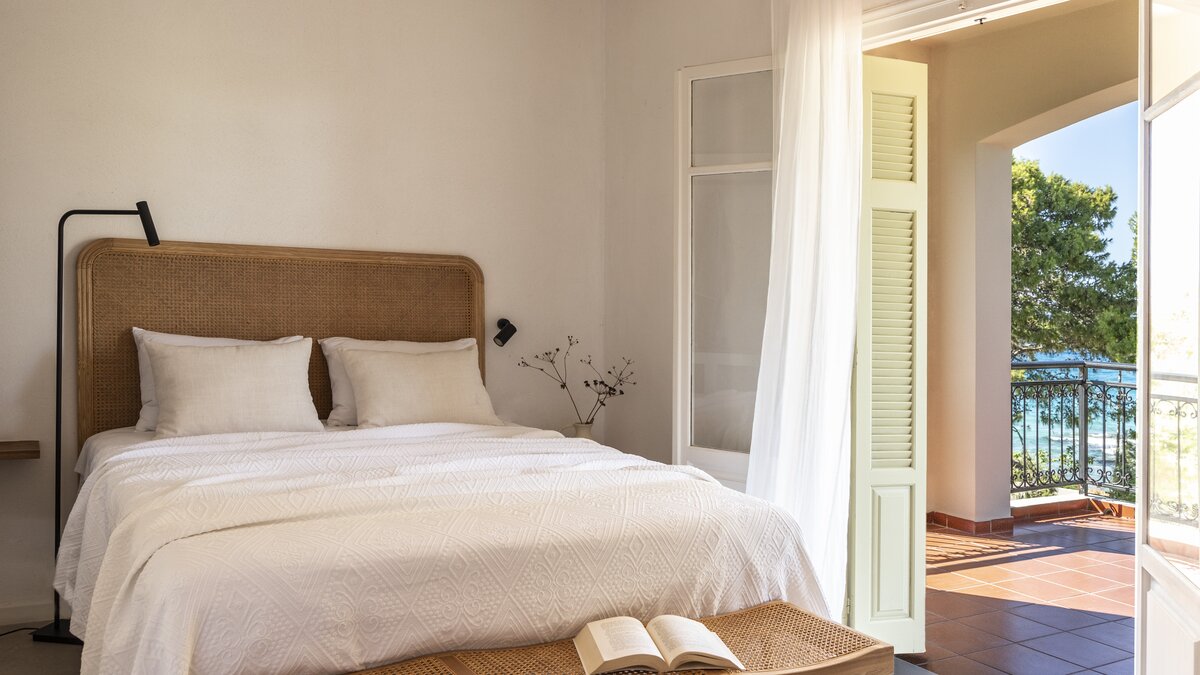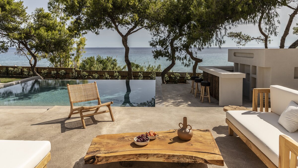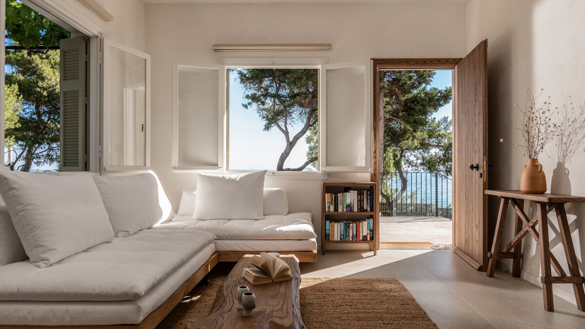 Im Inneren der Villa werden echte Materialien in jeden Raum integriert, um ihren neorustikalen Stil zu erreichen, mit Naturfarben, Holz, Marmor und Eisen, die alle in sanften Erdtönen ausgestellt sind. Des Wohnzimmer ist ein gemütlicher Raum, in natürliches Licht getaucht, perfekt ergänzt durch die Aussicht auf die Küste und die beruhigenden Geräusche entfernter Wellen. Eirini bietet bequem Platz für bis zu vier Personen und verfügt über zwei voll ausgestattete Küchen, von denen eine im Freien mit einem Grill liegt. Sowohl das Doppel- und auch das Hauptschlafzimmer verfügen über Super-Doppelbetten für zusätzlichen Komfort, und sorgfältig ausgewählte Kunst und Beleuchtung runden das Interieur der Villa stilvoll ab.