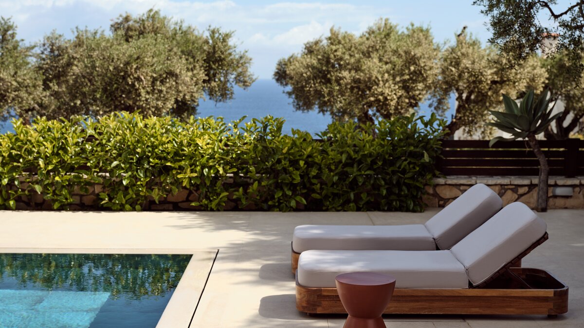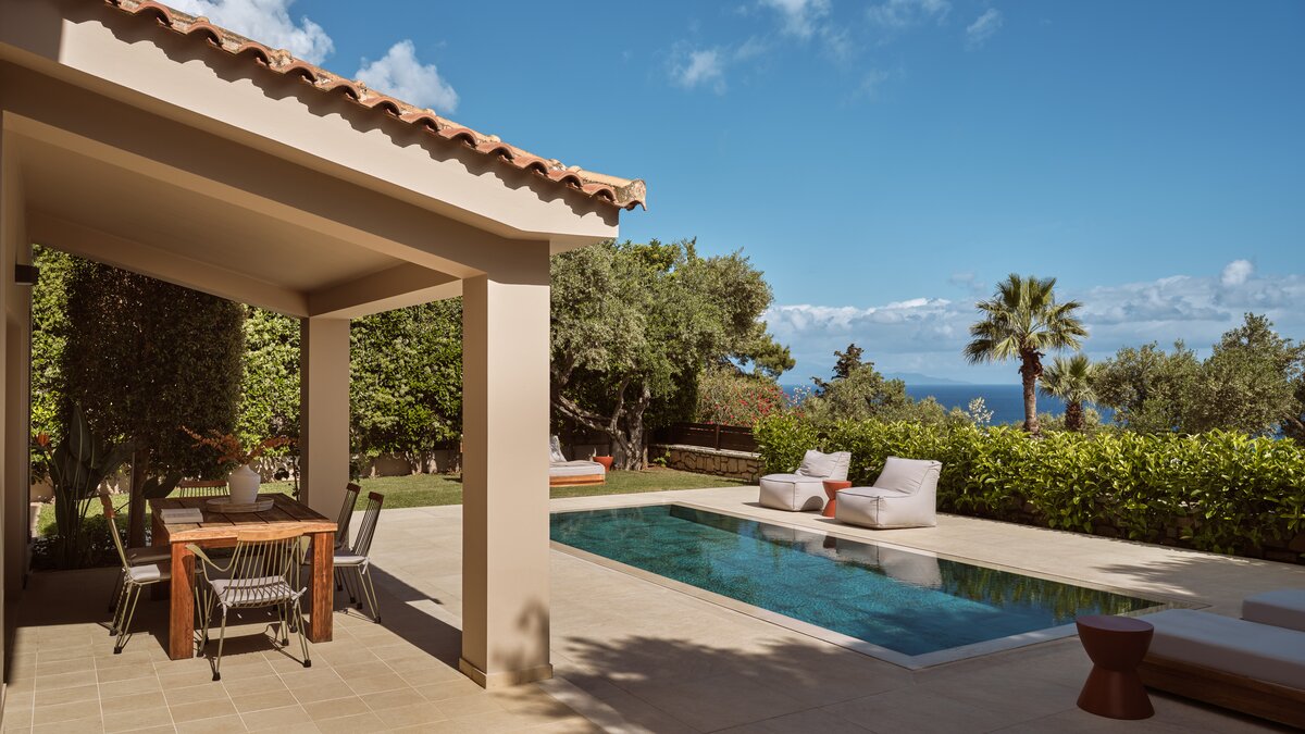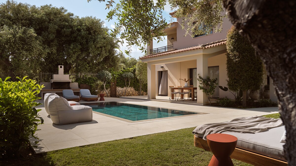 Beruhigende Grautöne beruhigen die Seele in dieser modernen 6-Personen-Villa in der Nähe von Zakynthos Stadt.