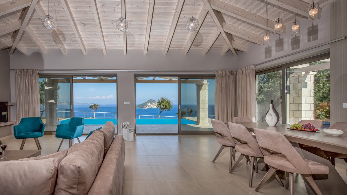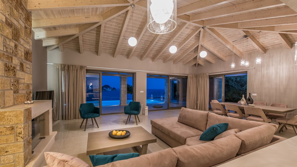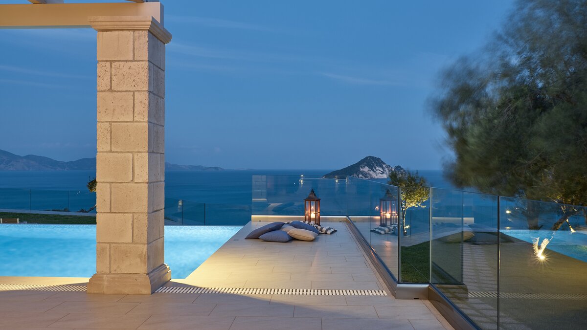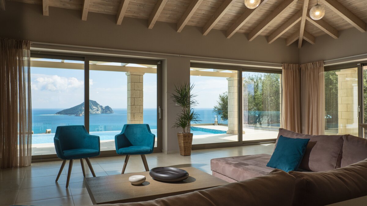 Diese elegante, aus Stein erbaute Poolvilla ist eine der neuesten Ergänzungen an der herrlichen Südwestküste von Zakynthos. Die Villa liegt privat auf einem Hügel oberhalb des Dorfes Limni Keri und bietet einen herrlichen Blick auf das Meer bis zur Schildkröteninsel von Marathonisi. Obwohl das Haus charmant modern ist, wurde es so gestaltet, dass es den klassischen zakynthischen Inselstil beibehalten hat. Es gibt ein unglaublich einladendes natürliches Design im Inneren – angefangen bei der großen, offenen Lounge mit riesigen Schiebetüren, die das Beste aus der idyllischen Meereskulisse machen. Abgesehen von den gelegentlichen Farbtupfern trägt die Villa einen wunderbar neutralen Stil im gesamten Erdgeschoss. Es gibt einen Esstisch, einen großen Steinkamin und einen modernen Küchenbereich mit Barhockern und allem notwendigen Komfort. Denen gefliesten Bäder sind modern und jedes der drei Schlafzimmer wurde einfach gestaltet, mit einem großen Doppelbett als herausragendes Herzstück. Zwei Schlafzimmer bieten auch den zusätzlichen Genuss eines eigenen Bades. Treten Sie nach draußen und es gibt einen wunderbar angelegten Garten, um Sie zu begrüßen. Freuen Sie sich auf Hängematten, Liegestühle, sonnendurchflutete Poolterrassen und einen eingebauten Grill – und einen atemberaubenden Pool, von dem Sie einige der fantastischsten Ausblicke auf das Ionische Meer genießen können. Wenn Sie Lust haben, in den Tag zu gehen, ist das Limni Keri Beach nur fünf Minuten von der Villa entfernt, oder es ist eine 13 km lange Fahrt zum wunderschönen goldenen Sandstrand von Kalamaki Beach.
