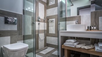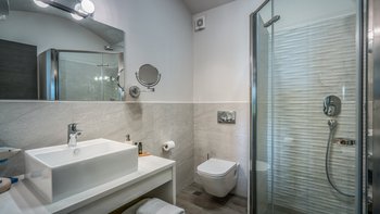 Die gewölbte überdachte Terrasse führt zum geräumigen Wohnbereich der Villa, der den größten Teil des Erdgeschosses einnimmt. Es gibt einen modernen, wenn auch skurrilen Stil – schöne Farbelemente erwecken den Wohnbereich zum Leben, und es gibt viele bequeme Sitzgelegenheiten für gemütliche Nächte in der Villa. Der Sitzbereich führt zum Esstisch im Innenbereich, sodass Sie wählen können, ob Sie drinnen essen oder auf den angrenzenden Terrassentisch gehen möchten. Direkt am Ende der Etage befindet sich die moderne Küche. Es gibt eine Frühstücksbar und alle modernen Kücheneinrichtungen, die diesen Aufenthalt zu einem sehr komfortablen Aufenthalt machen. Im zweistöckigen Design der Villa befinden sich vier geräumige Schlafzimmer – eines mit Doppelbett im Erdgeschoss und weitere drei im ersten Stock. Während alle Zimmer einen anderen Stil haben, verfügt jedes über ein großzügiges, modernes Bad und ein unglaublich bequemes Doppelbett. Denen Zimmer im ersten Stock haben auch den Luxus, auf eine große private Terrasse mit fantastischem Blick auf die Bucht zu führen.