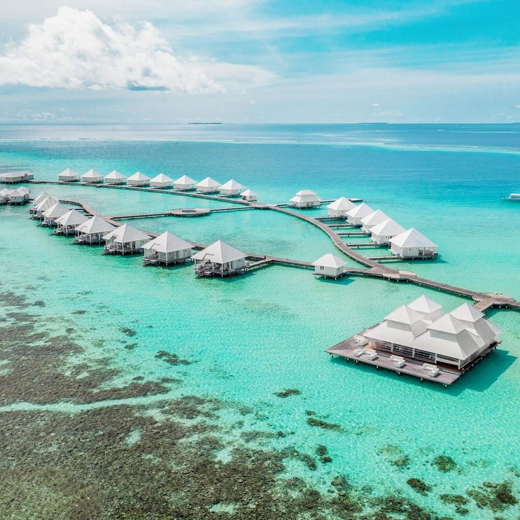- 51-60 qm, Villa, Wasserbungalow (auf Stelzen über der Lagune), Meerblick, Dusche, WC, Bademantel, Haartrockner, Holzboden, Klimaanlage, Ventilator, Minibar, Safe, WLAN, Wasserkocher, Kaffee/Tee, Terrasse (möbliert), direkter Meerzugang