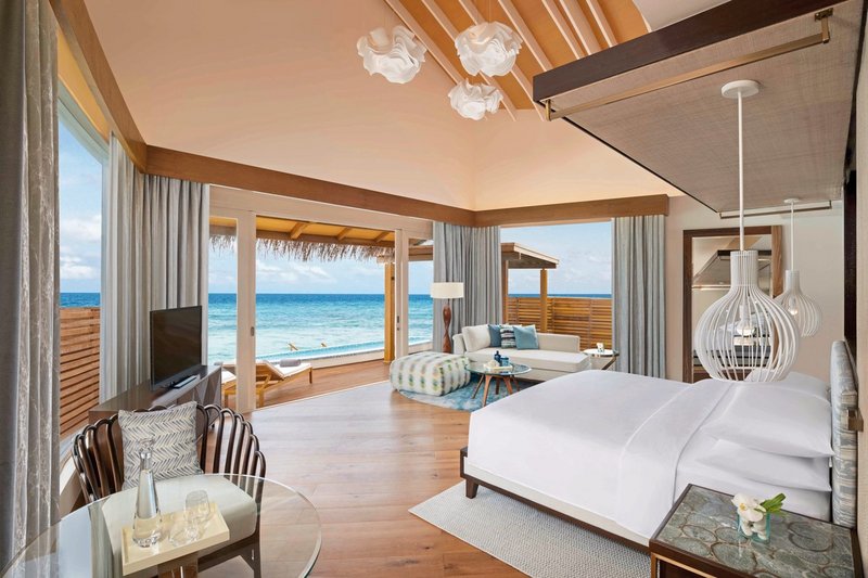 - 234 qm, Villa, freistehend, Sonnenaufgangsseite, Wasserbungalow (auf Stelzen über der Lagune), Meerblick, kombinierter Wohn-/Schlafraum, Sitzecke, Badewanne, Regendusche, WC, Bademantel, Badeslipper, Haartrockner, Klimaanlage, Minibar kostenpflichtig, Safe, Bügelbrett, Bügeleisen, TV, WLAN, Wasserkocher, Kaffeemaschine, Kaffee/Tee, Sonnendeck (möbliert), direkter Meerzugang, Privatpool, Butlerservice