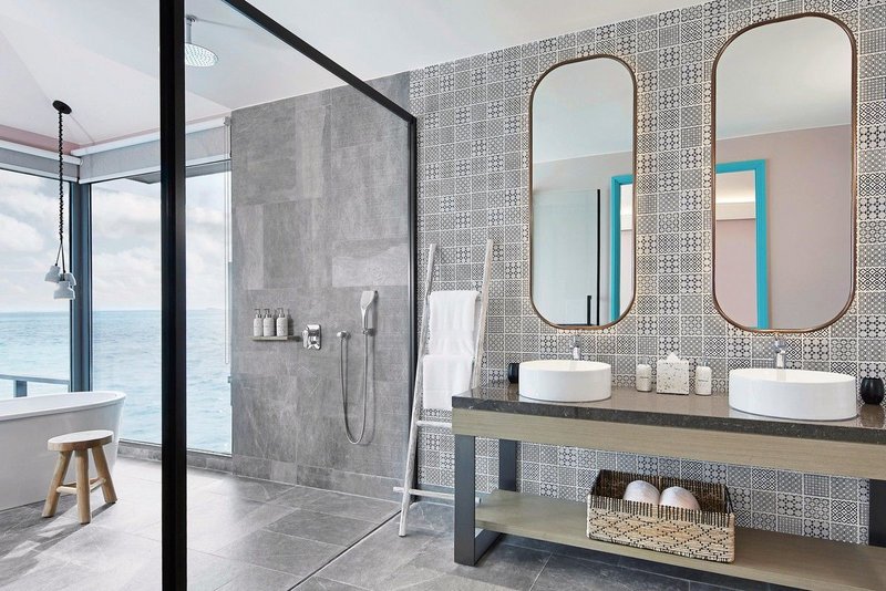 - 91-100 qm, an der Wasserlinie der Insel halb über dem Strand und halb über Wasser erbaut, Villa, freistehend, Wasserbungalow (auf Stelzen über der Lagune), Sonnenaufgangsseite, Ankleidebereich, Dusche, Badewanne, WC, Bademantel, Badeslipper, Haartrockner, Klimaanlage, Minibar kostenpflichtig, Safe, TV, WLAN, Wasserkocher, Espressomaschine, Kaffee/Tee, Sonnendeck (möbliert), direkter Meerzugang, täglich Wasser auf dem Zimmer
