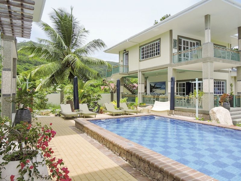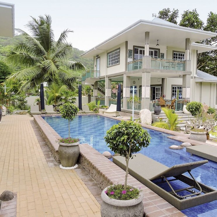 Eine Oase der Ruhe mit Blick auf die Berge von La Digue. Die Anlage liegt am Hafen – also perfekt für Angel- und Bootstouren. Und wer nicht selber kocht, lässt sich in einem der Strandrestaurants verwöhnen.