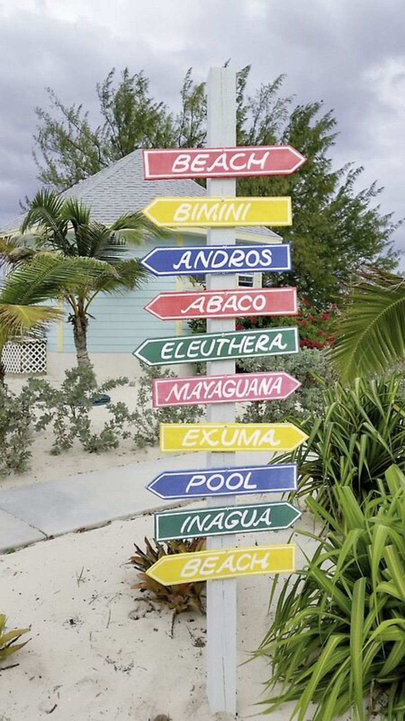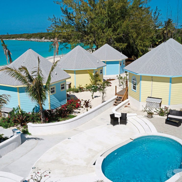 Wie himmelblaue und zartgelbe Farbtupfer wirken die hübschen Bungalows auf dem weißen Sand – so geht Bahamian Style. Genießen Sie auch typische Bahama-Küche im „Franco-Bahamian“!