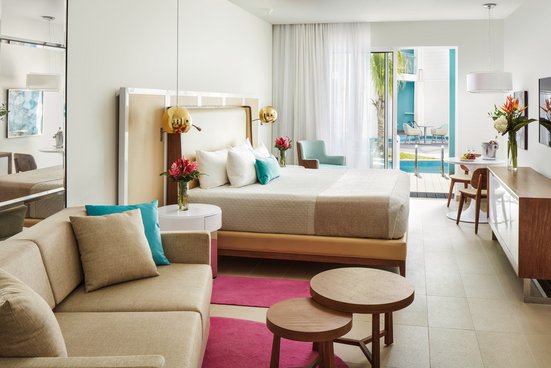 - 36-40 qm, Suite, Poolblick, kombinierter Wohn-/Schlafraum, Doppelbett (Kingsize), Regendusche, WC, Bademantel, Haartrockner, Kosmetikspiegel, Klimaanlage, Minibar, Softdrinks, Bier, Wasser, Safe, Bügelbrett, Bügeleisen, TV, Kaffee/Tee, Terrasse (möbliert), direkter Poolzugang, Kopfkissen-Menü