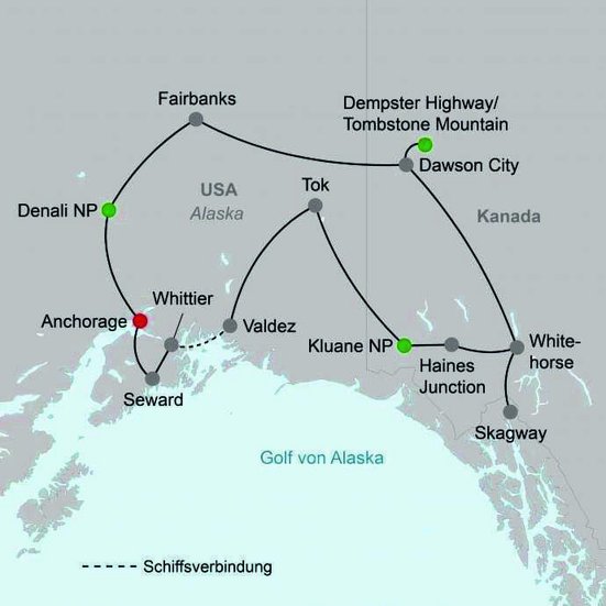 Sehen Sie einige der spektakulärsten Landschaften und Nationalparks Alaskas und Yukons. Sie folgen den Spuren der alten Goldgräber und Abenteurer, erleben im hohen Norden gewaltige Natur und bewundern die Tierwelt im Land der Mitternachtssonne.
