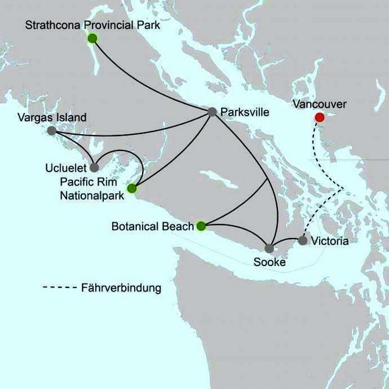 (Mo, Fr, So) Abholung am Flughafen Vancouver um ca. 8 Uhr morgens. Überfahrt mit der Fähre nach Vancouver Island. Nach einem Aufenthalt in Victoria fahren Sie nach Sooke. Sie erreichen Ihren ersten Zeltplatz. Heute werden Sie eine Wanderung durch das Naturschutzgebiet von Sooke unternehmen. Ihr Wanderweg schlängelt sich entlang von Klippen, Stromschnellen, Wasserfällen und verläuft über spektakuläre Felsüberhänge. Ca. 150 km + Fähre 1,5 h (A) Gehzeit ca. 3-4 Stunden, Weglänge ca. 13 km, Höhenunterschied 420 m