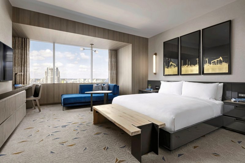 Edle Eleganz in Edmontons berühmtem Sport- und Unterhaltungsviertel Ice District. Von außen spiegeln sich Himmel und Wolken in der imposanten Glasfassade. Von innen geben die großen Fenster den Blick frei auf die beeindruckende Architektur der Stadt.