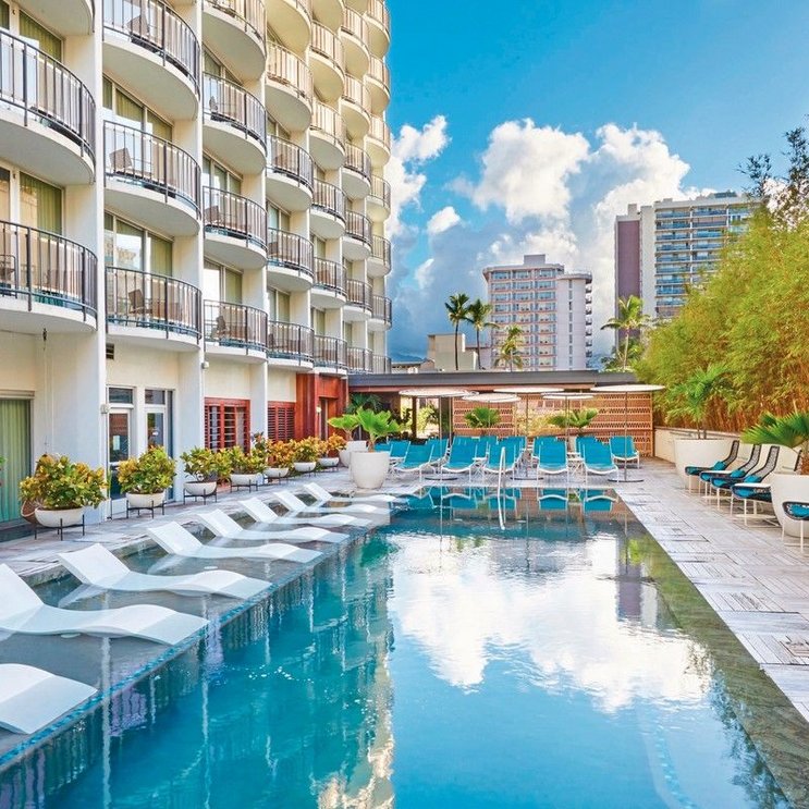 Für ein klassisches Hawaii-Erlebnis: Das Boutique-Hotel ist eine Hommage an das elegante Honolulu der 1960er Jahre, inspiriert vom Mid-Century-Stil, aufgelockert durch moderne Elemente. Der blühende Garten begeistert.
