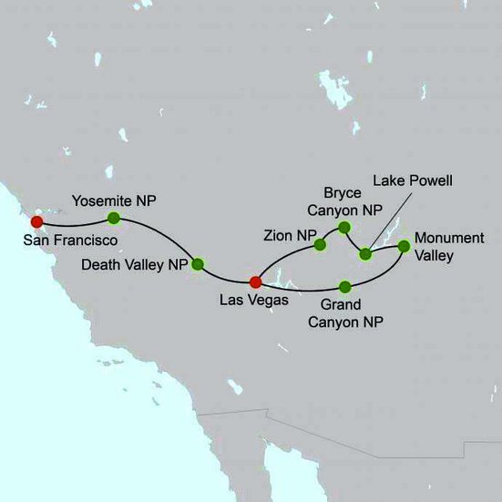 Von der Glitzermetropole Las Vegas aus erkunden Sie die bekanntesten Nationalparks des amerikanischen Westens. Der Grand Canyon Nationalpark, das Monument Valley und San Francisco sind nur einige der Highlights dieser Reise.
