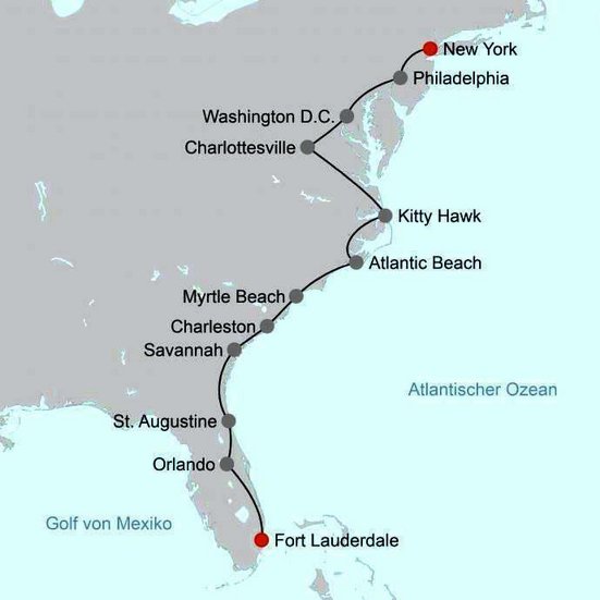 Spazieren Sie durch New York, lassen Sie sich faszinieren von der Machtfülle in Philadelphia und Washington D. C., geniessen Sie den Charme der Südstaaten und unbegrenztes Freizeitvergnügen in Orlando sowie einen Badeaufenthalt im Sonnenstaat Florida.