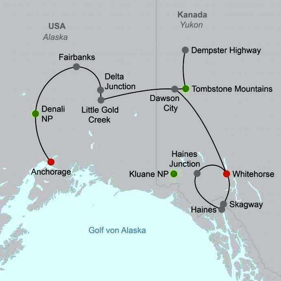 Die Region rund um den mächtigen Yukon strotzt vor Leben und spektakulären Landschaften. Kleine Orte, Raststätten und alte Poststationen erinnern an den grossen Goldrausch vor 100 Jahren.