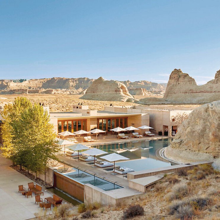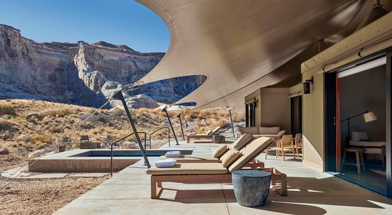 Das Hotel: Inmitten der traumhaften Wüsten- und Felslandschaft nahe des Lake Powell und zu den Naturwundern an der Grenze zwischen Arizona und Utah gelegenes Luxusresort, das sich in seiner besonderen Bauweise aus Beton, Glas und Holz ideal in die Umgebung einfügt. Dazu das im April 2020 entstandene Luxuscamp Sarika nur wenige Autominuten vom Resort entfernt, bestehend aus zehn luxuriösen Zelten mit eigenem Pool, einem Haupt-Pavillon sowie zwei Spa-Suiten, einem Gemeinschafts-Pool und einem Jacuzzi, umgeben von 250 ha purer Wildnis. Das Hotel der renommierten Amanresorts bietet Lounge mit Bibliothek, die in den erstklassigen Dining Room übergeht. Beheizbarer Swimmingpool mit Terrasse. Spa mit beheizbarem Pool, offenem Kamin und Behandlungsräumen, Ruhezonen und Pavillons. Anwendungen basieren auf asiatischen Prinzipien mit indianischen Einflüssen. Sauna, Dampfbad, Fitness-Center, Yogakurse (Anwendungen, Massagen und Beautysalon gegen Gebühr). Parken ohne Gebühr. Flughafen Las Vegas ca. 4-5 Autostunden, Flughafen Page ca. 25 Autominuten entfernt.